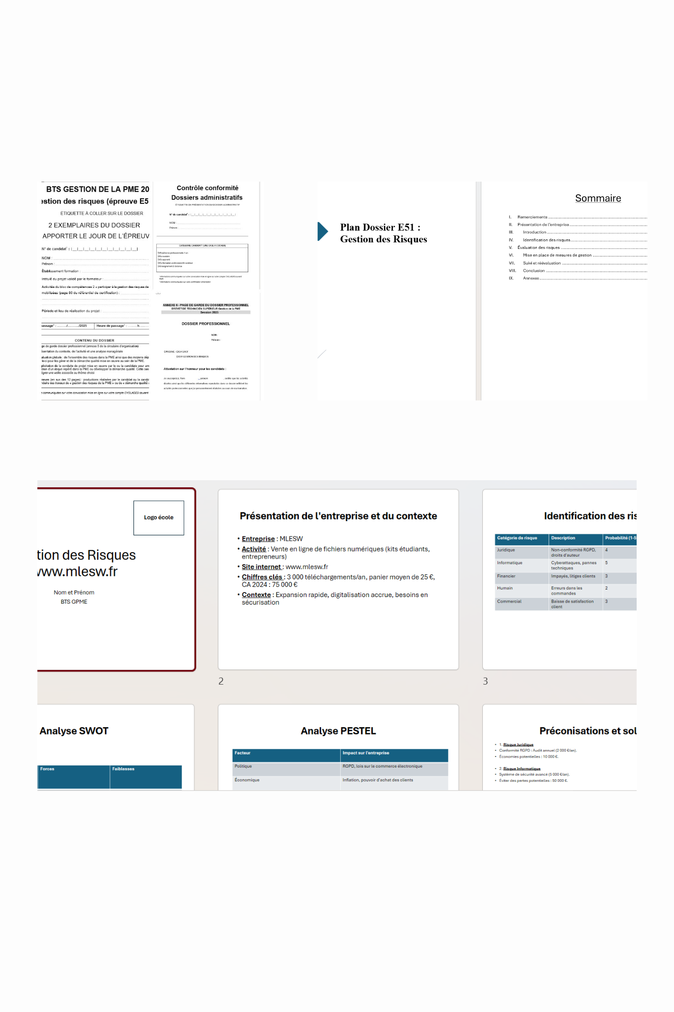 Le Dossier E51 – Gestion des Risques pour les BTS GPME est un outil indispensable pour réussir votre épreuve E51. Conçu pour répondre aux exigences académiques, ce kit complet inclut un dossier structuré et une présentation PowerPoint pour l’oral, adaptés aux attentes du jury.